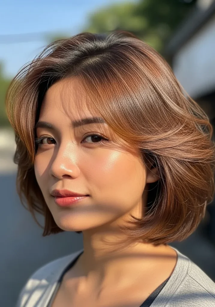 This bob sits neatly at the chin with airy feathered layers that lift away from the face. The warm chestnut tone looks glossy in the sun and the soft curves through the ends give the whole cut a breezy shape. The texture feels silky with a hint of natural movement.