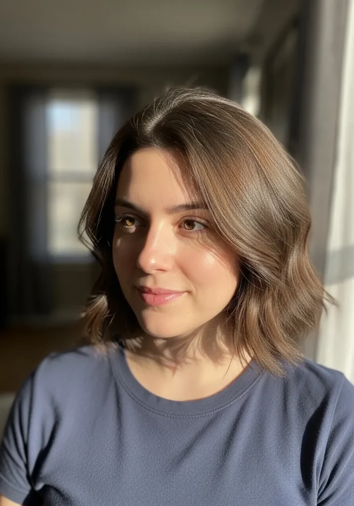 This bob has a soft wavy texture that falls just above the shoulders with gentle feathering framing the cheeks. The warm brunette shade catches the sunlight and gives the style a smooth natural glow. The waves keep the look effortless while the feathered layers add a touch of lightness.