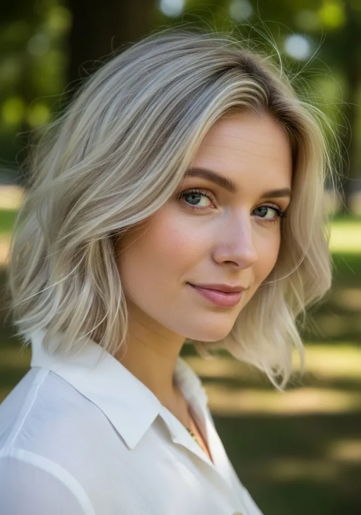 This bob sits at a comfortable mid length with gentle waves adding a playful twist. The cool blonde shade brings fresh brightness while the feathering keeps the ends light and airy. The texture looks soft and natural in the light.
