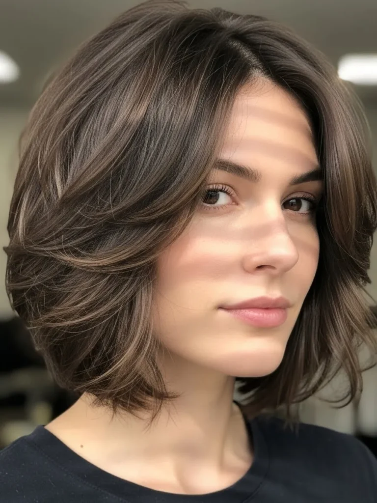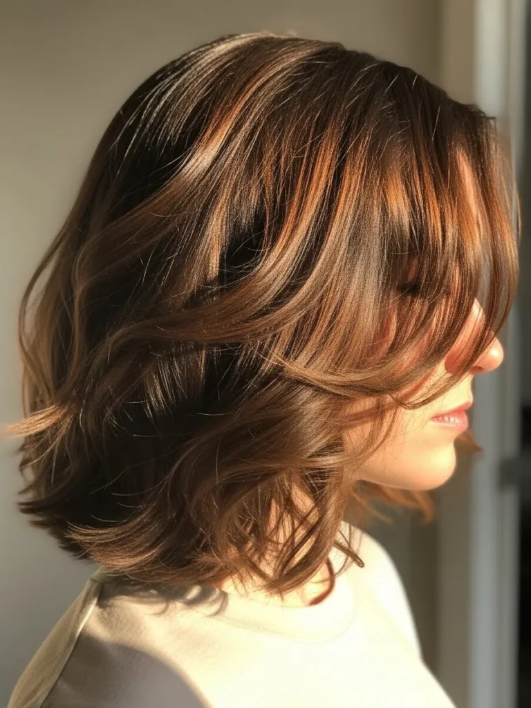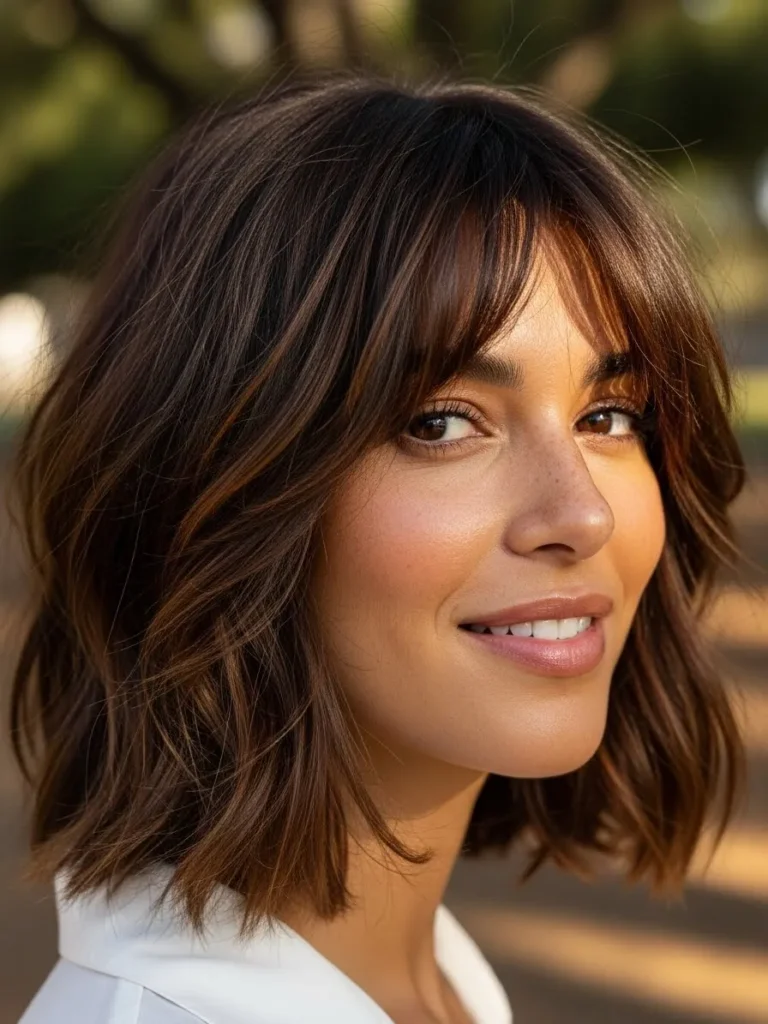 This layered bob has feathery ends that create plenty of movement and a wispy fringe that softens the eyes. The mix of warm brunette and caramel tones adds depth that enhances the texture. The overall style has a cute, youthful bounce while still feeling grown up.