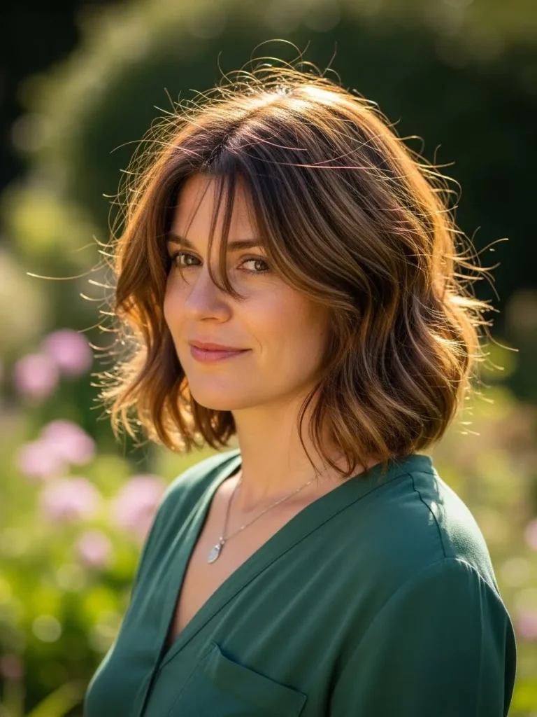 This chin grazing bob has easy waves that add a soft, breezy feel. The layers are light and blended, giving the cut natural movement without feeling overly styled. Warm brunette tones with gentle highlights catch the sunlight beautifully and bring a glow around the face.