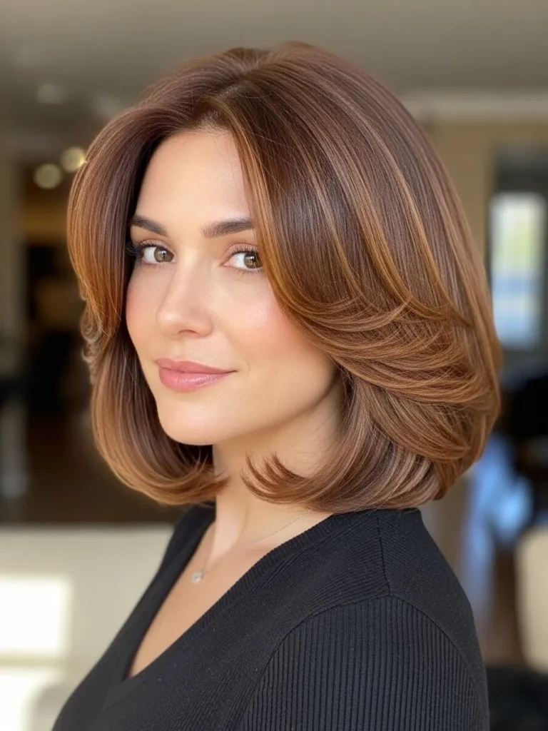 This layered bob sits around shoulder length with soft layers that move naturally through the ends. The warm brown shade catches the light beautifully and enhances the dimension of the cut. The texture looks smooth with a gentle bend that keeps it from feeling stiff. The style feels relaxed and wearable.