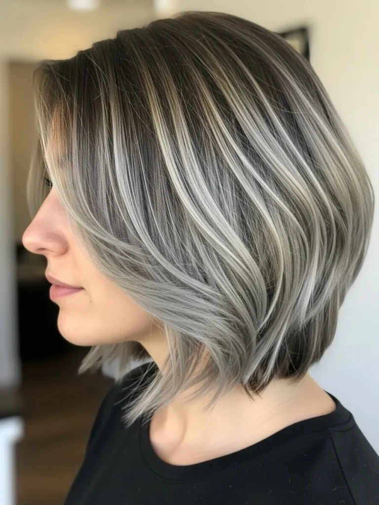 This angled bob shows off a gorgeous blend of charcoal roots and icy silver highlights that flow through every layer. The soft waves give the color dimension and keep the cut looking light and airy. The shape frames the jawline gently while the layers add just enough movement to keep things modern and fresh.