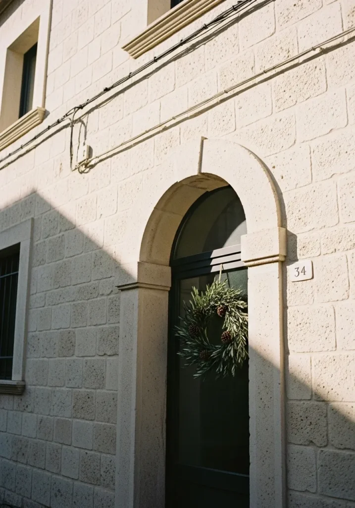 This light stone exterior with its arched doorway feels elegant and sunlit even in winter. The simple wreath of pine and small pinecones adds just enough greenery to bring a natural holiday touch without overpowering the refined stonework.