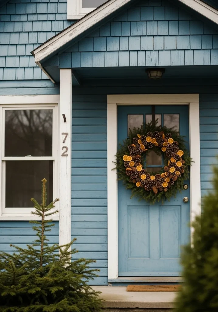This sweet blue cottage brings a playful twist to natural holiday decor. The wreath features pinecones and dried orange slices mixed with pine greenery, adding warmth and a touch of rustic charm against the soft blue door.