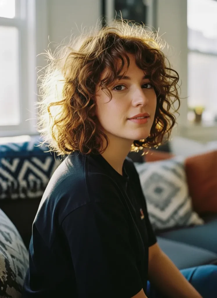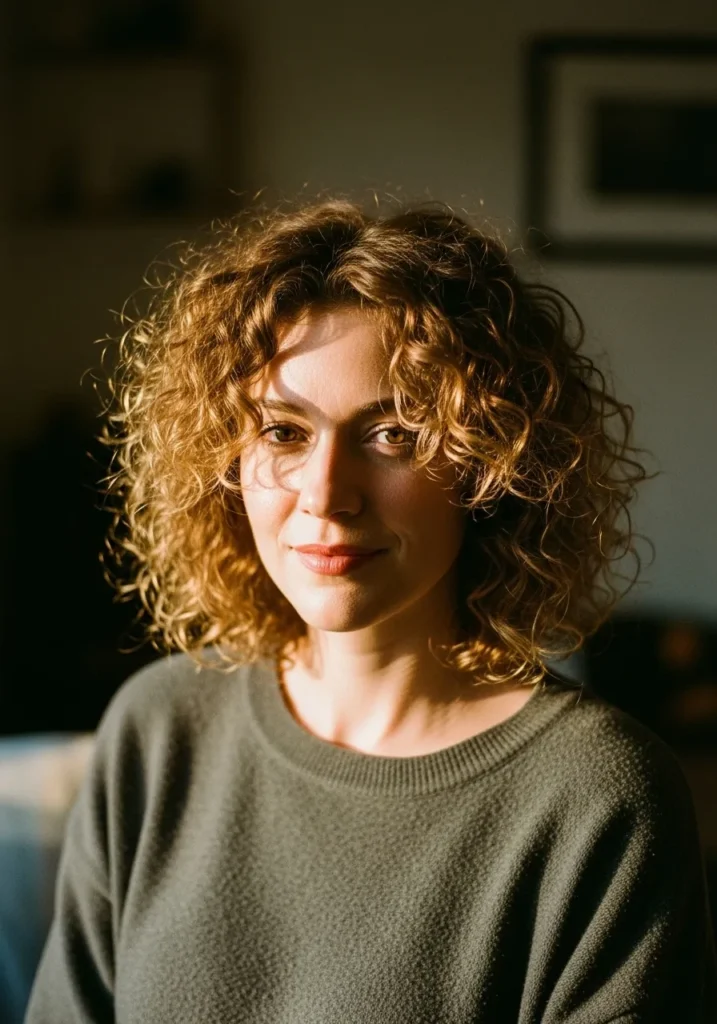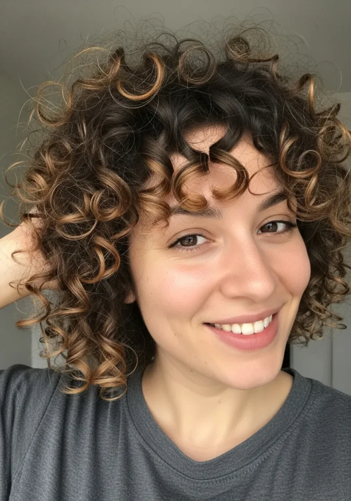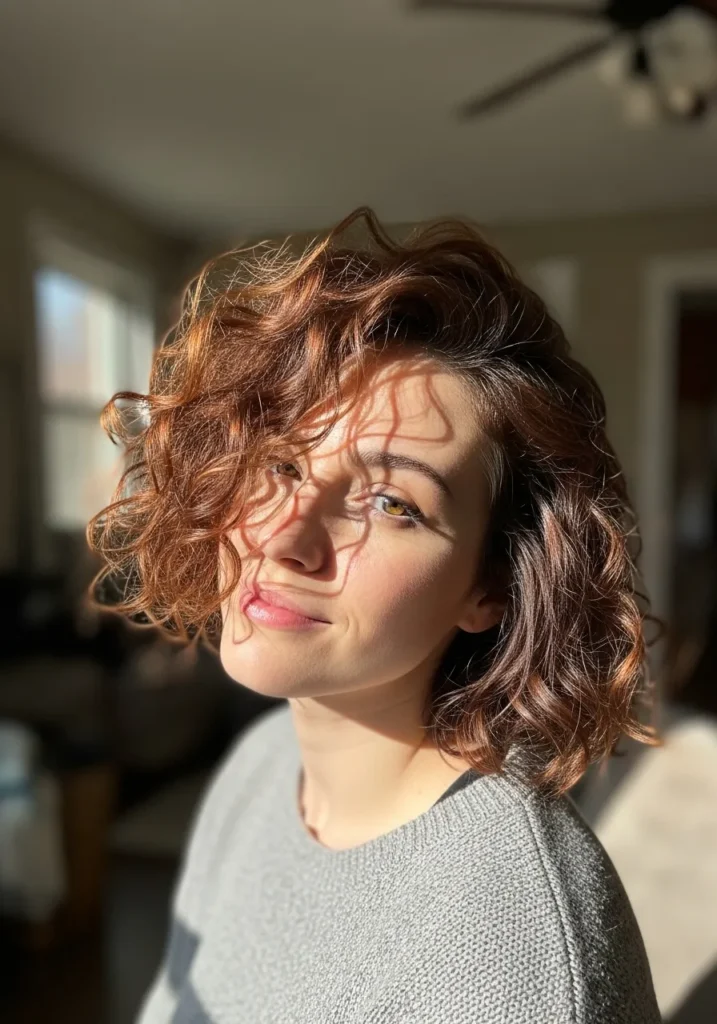 Sunlit Curly Bob with Soft Copper Highlights