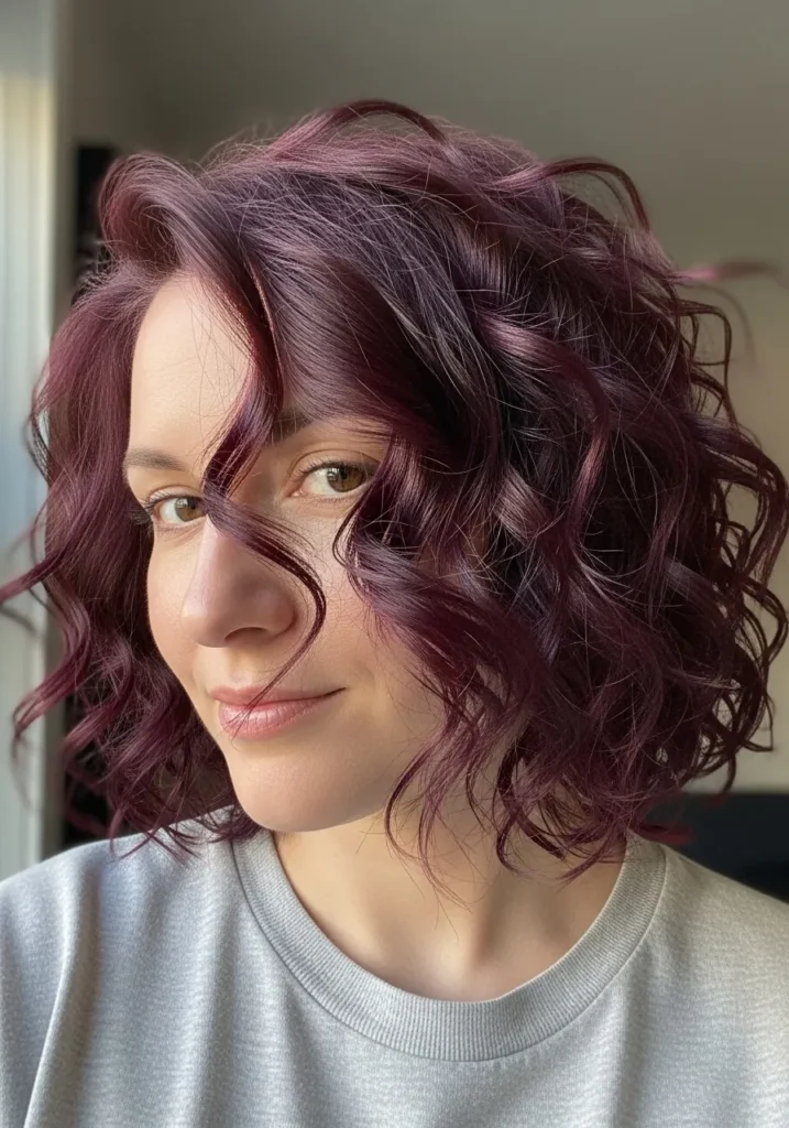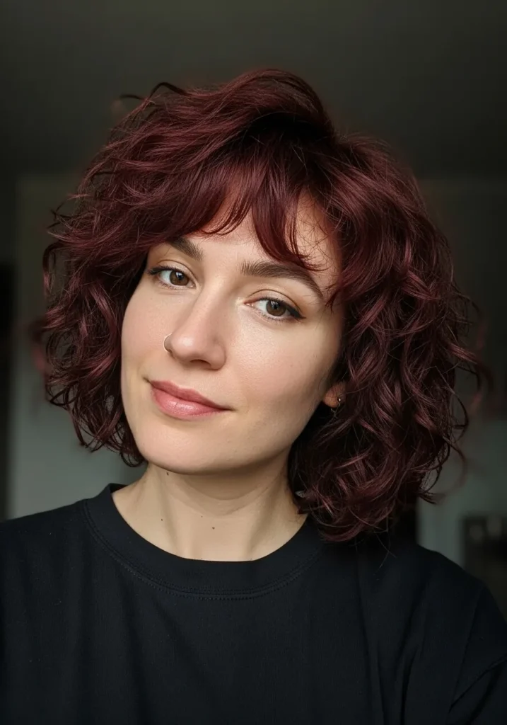 Soft Burgundy Curly Bob with Feathered Fringe
