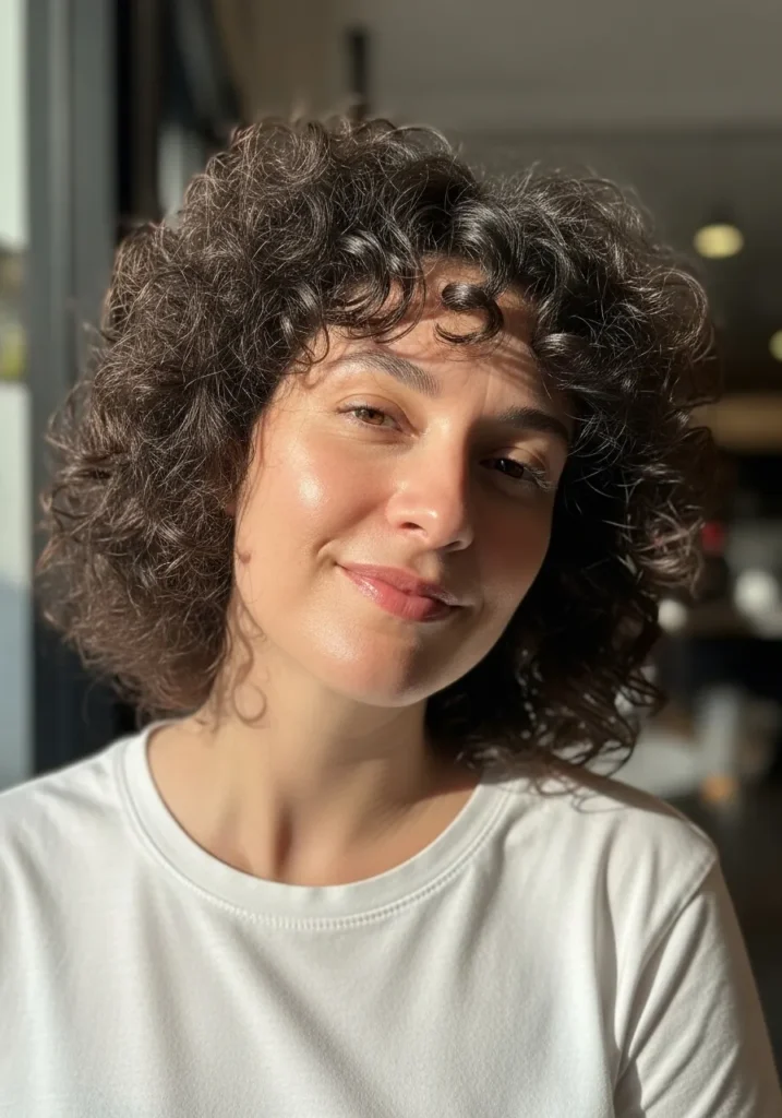 I love this look because it gives me that perfect mix of volume and softness. The curls lift away from my face in such a flattering way and it always feels like my cheekbones get a tiny boost. The length is short enough to feel breezy but still long enough to play with curl definition. It is one of those styles that makes me feel put together even on days when I barely touch my hair.