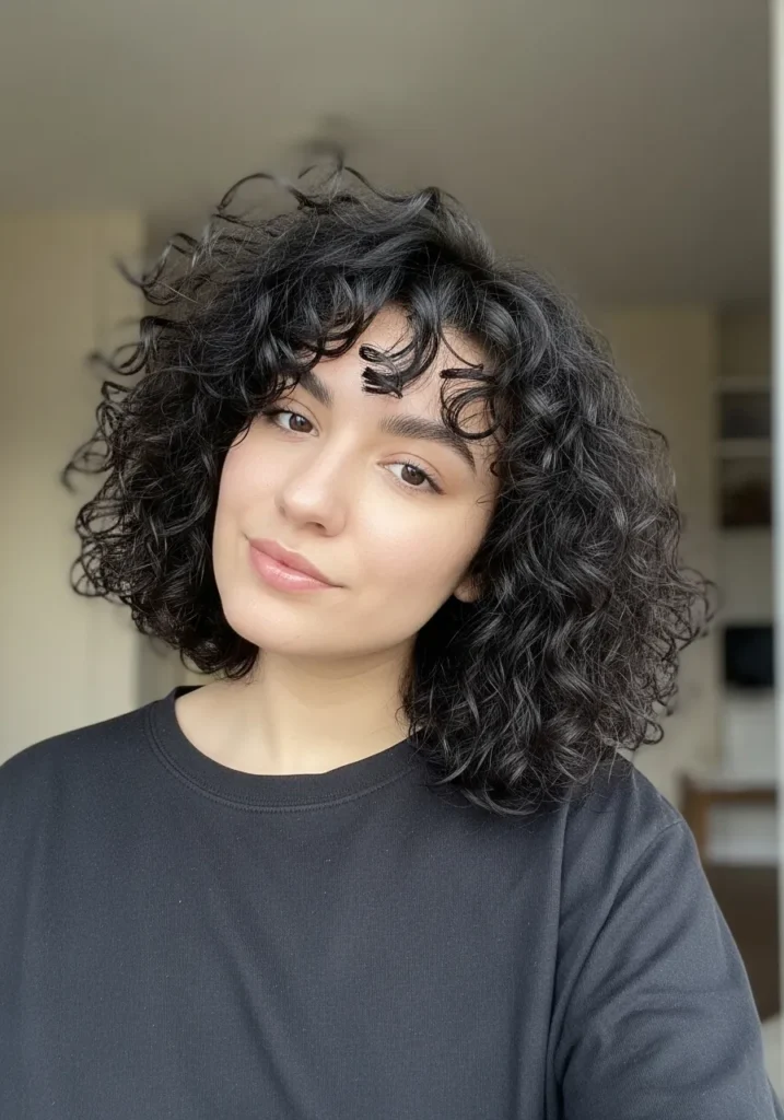 I love how this kind of curl pattern instantly adds personality without needing extra styling. The airy fringe brings attention to the eyes in such a flattering way, and the rounded shape makes thick curls feel balanced instead of overwhelming. It’s the kind of bob that gives me that little confidence spark the moment I catch my reflection because it celebrates natural curls instead of controlling them.