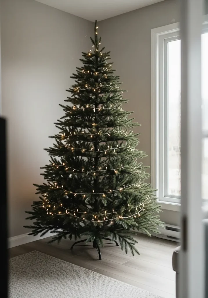 This Christmas tree setup embraces the quiet charm of simplicity. A lush evergreen stands tall in a sunlit corner, wrapped only in warm white string lights that softly twinkle against the muted gray walls. The uncluttered space, clean flooring, and large window create a natural, airy backdrop that lets the tree’s organic texture take center stage. There’s no rush of color or ornament overload here—just a peaceful balance of greenery, light, and calm.