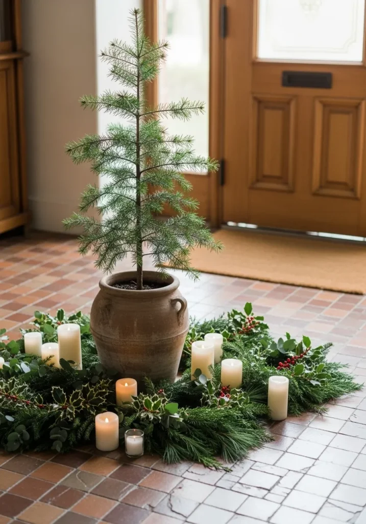 This cozy entryway captures the beauty of simplicity with a small potted evergreen tree standing proudly in a rustic clay urn. The natural terracotta tones pair so perfectly with the warm wood door and tiled floor, while a lush ring of fresh greenery and holly surrounds the base. The soft glow of pillar candles scattered among the branches adds a magical warmth that feels both festive and organic. Everything about this setup whispers effortless holiday style, grounded in nature and timeless charm.