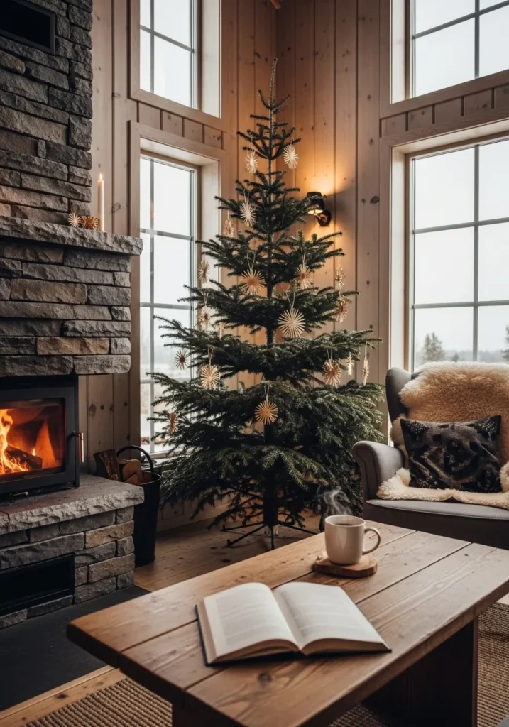 This cozy corner feels like a peaceful mountain retreat brought to life. The tall windows flood the room with natural light, making the Christmas tree the perfect green centerpiece. Adorned with simple golden ornaments that echo the soft glow from the stone fireplace, the space balances rustic textures with refined touches. The wooden walls, plush armchair, and fur throw add layers of warmth that make the whole room feel like a deep exhale after a long day.