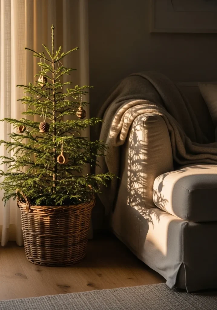 This cozy living corner feels like a gentle hug at golden hour. The small Christmas tree, set in a woven wicker basket, adds just the right touch of nature without overwhelming the space. Its delicate wooden ornaments blend perfectly with the earthy tones of the soft sofa and light curtains. The sunlight filtering through creates beautiful shadows that dance across the walls, making everything feel warm, calm, and so effortlessly organic.