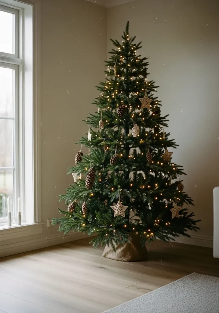 This room captures the kind of holiday serenity that makes you want to linger just a little longer with a cup of coffee in hand. The Christmas tree stands tall and natural, dressed in the softest string lights and a mix of wooden stars and pinecones. Its base is wrapped in a simple burlap cover, perfectly complementing the light oak flooring and clean white walls. With daylight streaming in from the large window, the whole space feels bright, fresh, and wonderfully uncluttered.