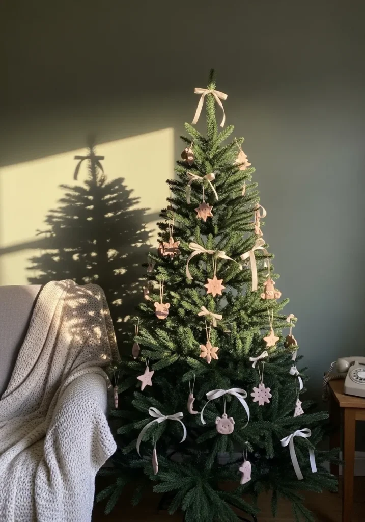 This cozy space shows off a Christmas tree that feels effortlessly organic. The soft green branches are dressed in simple beige ribbons and handmade clay ornaments, creating that lovely mix of minimal and meaningful. A warm stream of sunlight spills across the room, casting delicate shadows on the wall and blanket-covered chair. Everything feels calm, uncluttered, and inviting, like a quiet December morning with coffee in hand and soft music playing in the background.