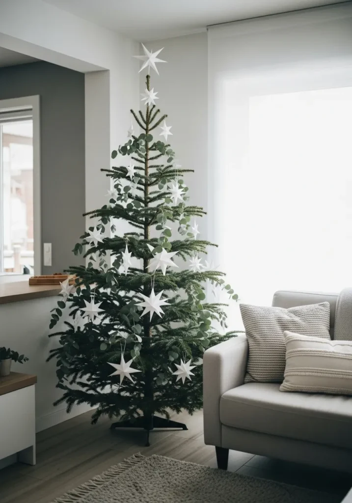 This cozy corner captures everything I love about modern Scandinavian Christmas style. The tree stands tall yet perfectly understated, its branches spaced out to showcase every delicate white paper star. A few sprigs of eucalyptus are tucked between the pine needles, softening the green with a gentle touch of silver. The neutral palette of the room—with its creamy sofa, textured throw pillows, and warm wooden accents—keeps the whole space airy, calm, and full of quiet charm.