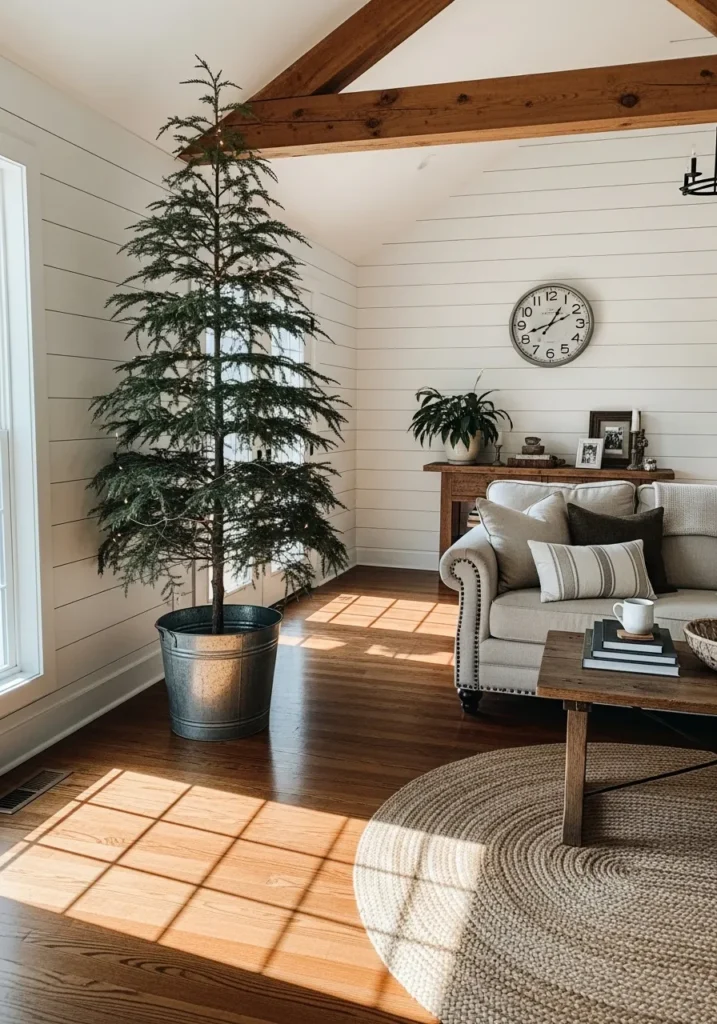 This space perfectly captures that effortless organic feeling with its tall, naturally sparse Christmas tree standing gracefully in a simple galvanized bucket. The soft morning light pouring through the large windows dances across the warm wooden floors, highlighting the creamy shiplap walls and exposed beams above. The neutral-toned sofa, cozy striped pillows, and woven rug all add a relaxed texture that feels calm and grounding. It’s a room that doesn’t need much to make a statement because every element already feels so intentional and quietly beautiful.