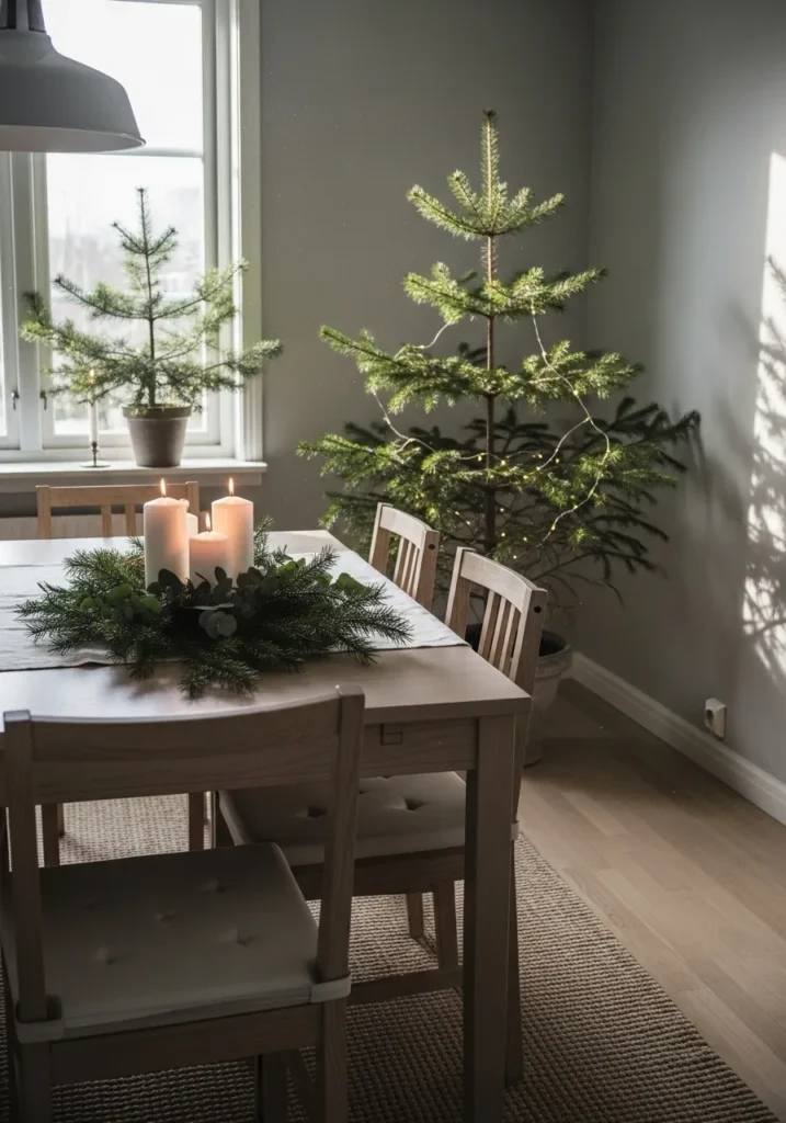 This cozy dining space captures that perfectly effortless Scandinavian charm I adore. The light wood furniture feels fresh and inviting, while the pale gray walls quietly let the natural greenery take center stage. Two simple Christmas trees add a gentle festive note without stealing attention, and the soft candle centerpiece ties it all together with its calm glow and hint of pine fragrance. The whole room feels balanced, natural, and beautifully understated.