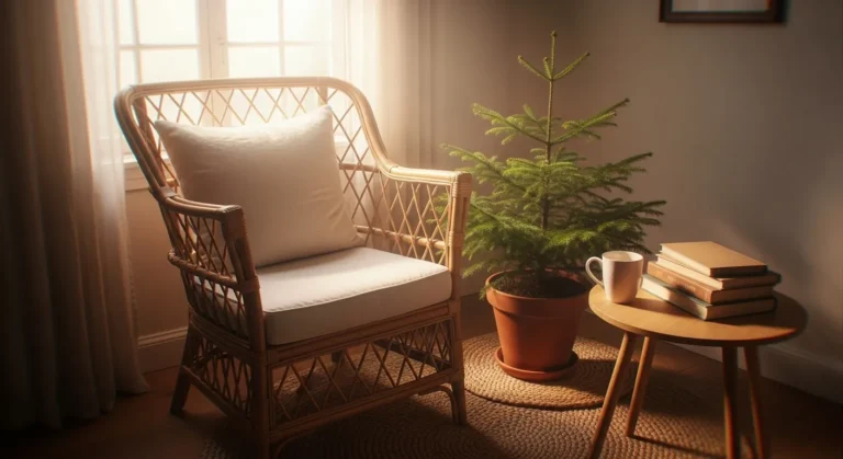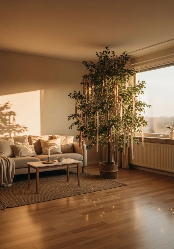 This Scandinavian-inspired living room feels like a warm hug from the afternoon sun. The natural light spills across soft beige walls, a woven jute rug, and a neutral-toned sofa layered with textured pillows. A tall indoor tree stands gracefully by the window, its leaves catching the golden glow, while simple ribbons drape gently from the branches for a festive touch. Everything about this space whispers calm and natural beauty, with wood tones and cozy textiles creating a look that’s effortlessly organic and inviting.