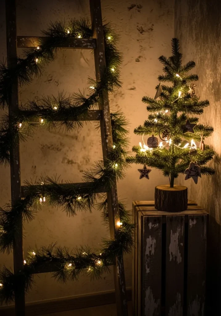 This cozy little corner feels like a secret hideaway straight from a winter cottage. The small Christmas tree, perched on a rustic wooden crate, is dressed in simple star and pinecone ornaments with soft twinkling lights that make the whole space glow. Right beside it, an old wooden ladder wrapped in garland and fairy lights adds a charming handmade touch, the kind of thing that makes you want to curl up with a blanket and cocoa. The worn textures, soft lighting, and greenery all come together to create a look that’s understated but full of heart.