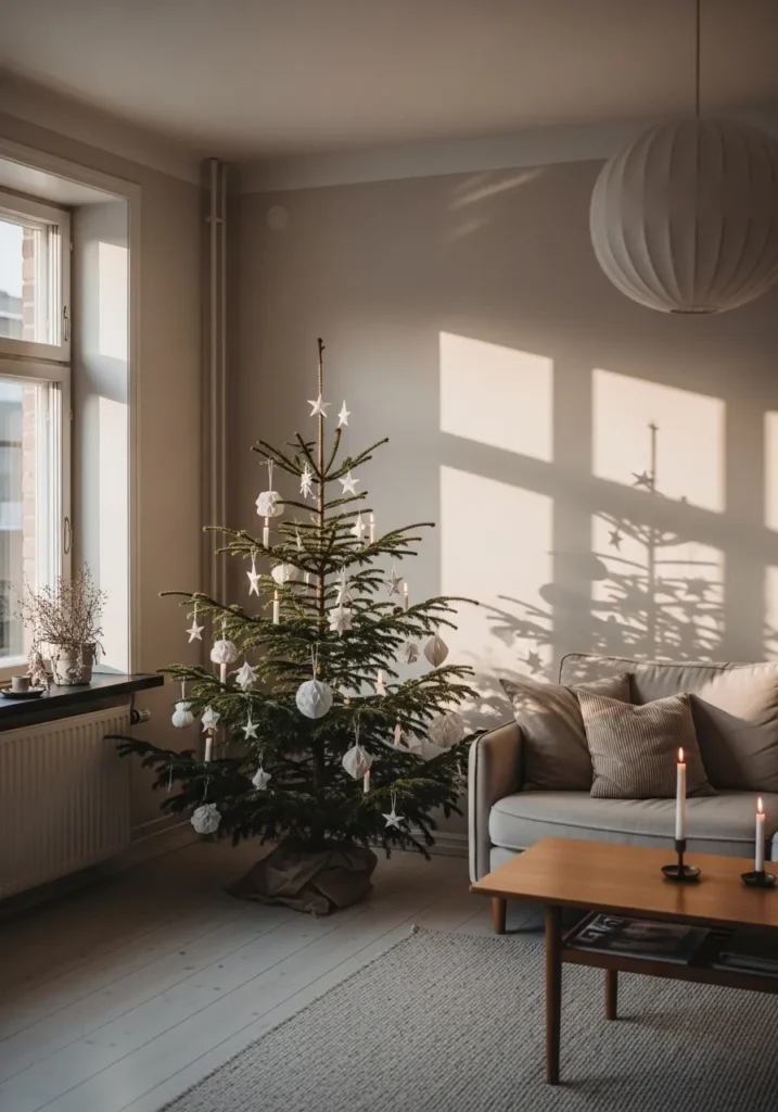 This living room is the perfect example of calm simplicity meeting natural charm. The soft afternoon light washes over pale walls, a cozy beige sofa, and a minimal wooden coffee table that holds two slender candles. The Christmas tree feels delightfully effortless, dressed in handmade white paper ornaments and delicate star shapes. There’s no tinsel or glitter here, just pure greenery and clean lines that let the natural beauty of the tree take center stage. The whole space radiates that Scandinavian magic where less really does feel like more.
