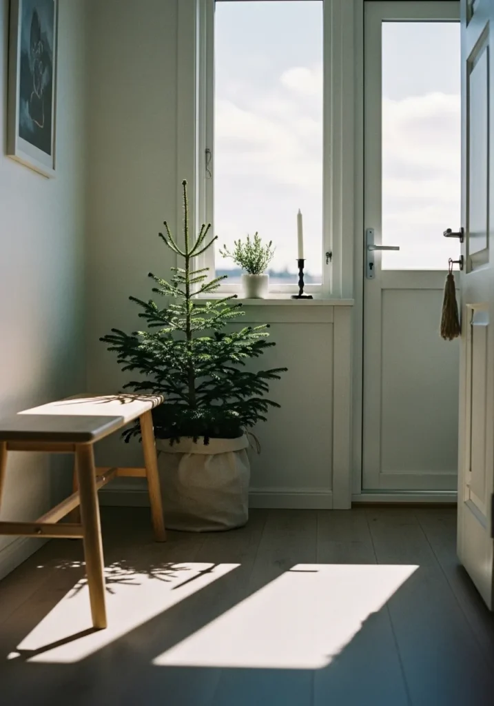 This little entry nook captures that effortless Scandinavian charm we all secretly wish our homes had. The small Christmas tree sits neatly in a neutral fabric pot, soaking up the soft daylight that spills through the glass door. A simple wooden bench adds warmth to the pale flooring, while a single candle and a tiny potted plant on the windowsill give the whole space a serene and intentional feel. Every detail whispers calm, from the clean lines to the gentle natural light.