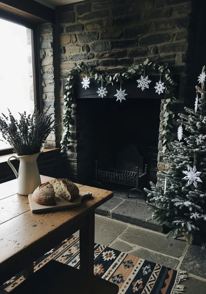 This cozy stone fireplace scene feels like it belongs in a countryside retreat straight out of a winter daydream. The rough-textured stone walls frame a simple black hearth dressed with fresh eucalyptus garland and delicate white paper snowflakes, bringing an effortless organic touch. A petite Christmas tree dusted in snow stands nearby, echoing the snowy motif, while a rustic wooden table holds a loaf of crusty bread beside a pitcher filled with dried lavender. Every texture here—from the matte stone to the soft greenery—adds warmth and quiet elegance to the room.