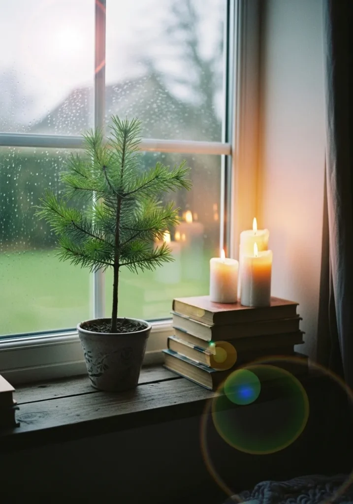 This little window nook feels like the definition of slow, peaceful living. A tiny potted pine sits proudly on a rustic wooden ledge, its soft green needles catching the faint winter light that filters through a rain-speckled window. A neat stack of vintage books adds a touch of warmth and nostalgia, topped with glowing candles that flicker gently against the glass. It’s the kind of space that feels quietly magical—where nature, light, and texture blend in perfect harmony.