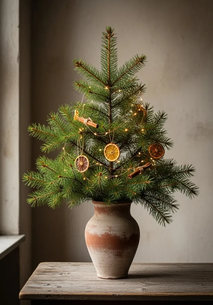 This charming little Christmas tree proves that you don’t need much to make a space feel festive. A miniature evergreen sits gracefully in a rustic clay pot, dressed with a few glowing fairy lights, dried orange slices, and tied cinnamon sticks. The combination of warm twinkle lights and natural decorations feels cozy and timeless, while the earthen pot adds an organic, handmade touch that pairs beautifully with any simple interior.