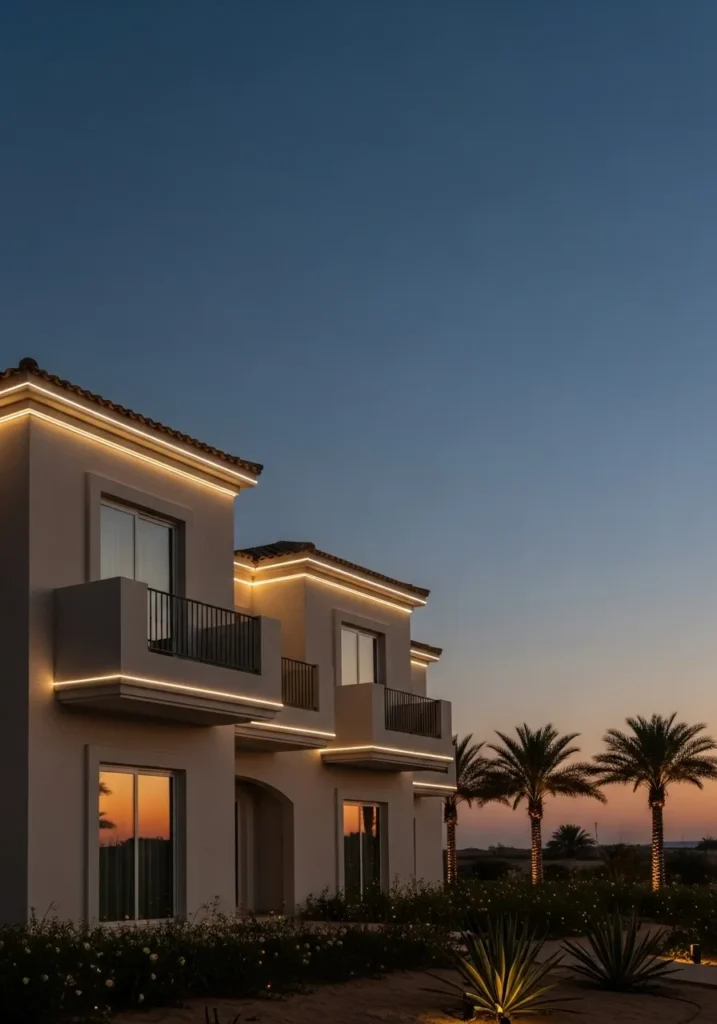 This home design feels like a warm exhale at sunset. The architecture leans into Mediterranean simplicity with creamy stucco walls, tiled roofs, and smooth lines that catch the fading daylight just right. Soft, neutral-hued lighting traces the outlines of the balconies and rooflines, wrapping the entire exterior in a golden halo. The glow pairs beautifully with the dusky sky and swaying palms, creating that perfect balance of calm and sophistication that never tries too hard.