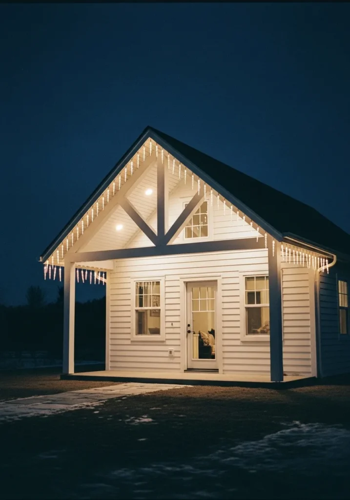 This charming little white cottage looks like something straight out of a winter postcard. The crisp siding glows softly under the gentle hue of warm icicle lights that frame the gabled roofline. It’s cozy and minimal at the same time, showing how simplicity can be just as magical as grandeur. The subtle illumination highlights the architectural lines perfectly, giving the house a peaceful glow that feels calm and welcoming against the quiet night sky.