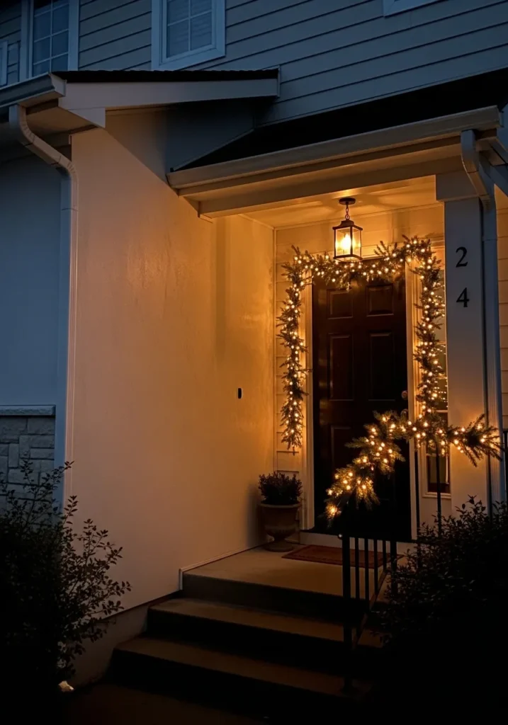 This home’s entryway gives off the coziest holiday welcome with its soft amber lighting and simple garland wrapped neatly around the dark front door. The warm white fairy lights highlight the doorway without overpowering it, creating that perfect balance between festive and understated. The gentle glow from the lantern light above adds just enough charm to make the whole entrance feel like a peaceful holiday retreat.