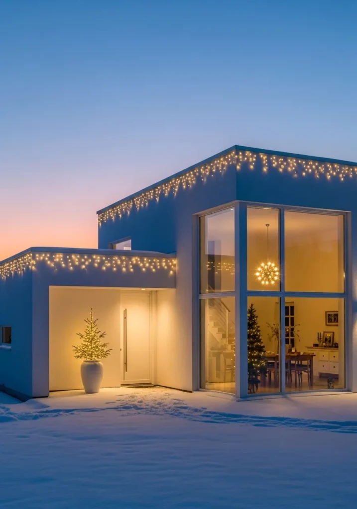 This house design is the perfect mix of sleek architecture and cozy Christmas warmth. The clean white exterior and sharp geometric lines are softened by a string of warm fairy lights draping gently along the roofline, creating that magical icicle effect without being over the top. Through the tall glass windows, you can see the soft golden glow of the interiors—a simple Christmas tree and a sparkling chandelier that add elegance without clutter. Even the little potted evergreen by the door feels perfectly placed, offering just enough festive charm to welcome you home.