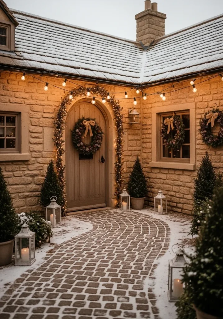 This cozy stone cottage feels straight out of a Christmas fairytale. Soft golden lights trace the roofline, wrapping the arched doorway in a gentle glow that feels so welcoming against the snowy backdrop. The cobblestone path, lightly dusted with snow, leads to a wooden door adorned with a lush wreath tied in a champagne-colored ribbon. Potted evergreens and lanterns with flickering candles line the walkway, adding the perfect touch of rustic charm to the peaceful neutral palette.