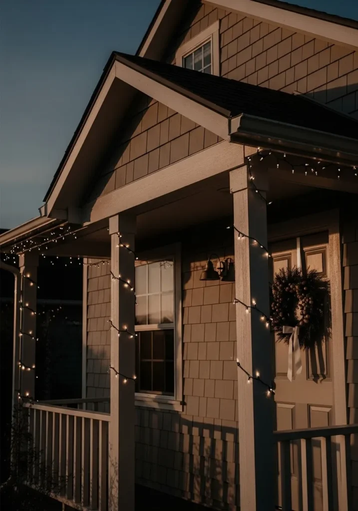 This cozy porch has the loveliest understated glow. Warm white fairy lights are wrapped neatly around the columns and along the trim, adding a soft sparkle that catches the last bit of sunset. The neutral shingle siding and pale beige door create a calm, earthy backdrop, while the natural wreath with muted tones keeps the decor elegantly simple. Everything feels warm, quiet, and timeless—like the kind of scene you’d see at golden hour on a peaceful December evening.