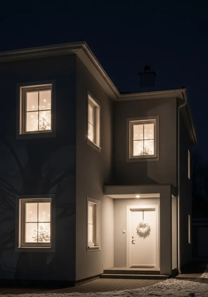 This modern two-story home is all about clean lines and calm simplicity. The soft gray exterior feels effortlessly elegant against the night sky, while the warm glow from the windows hints at cozy Christmas magic inside. Each window holds a softly lit tree, their neutral lights twinkling like quiet stars. The white front door, finished with a plush wreath, completes the look with understated charm. It’s the perfect example of how less really can be more during the holidays—no flashing lights or over-the-top colors, just warmth and grace.