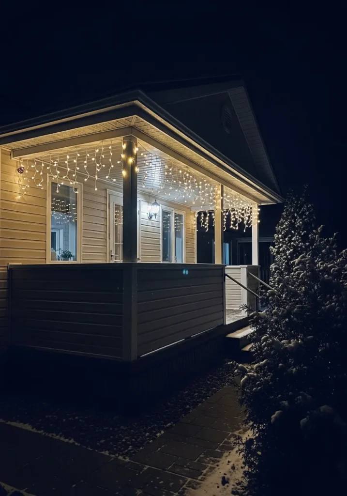 This charming corner porch feels like the perfect little hideaway for a quiet winter night. The cream siding is softly illuminated by a curtain of delicate white icicle lights that shimmer like falling snow. The lighting feels subtle yet magical, giving the entire space a serene, candlelit quality that’s so inviting you can almost feel the crisp air and hear the gentle crunch of snow underfoot. The touch of greenery and a hint of frost along the pathway add just enough holiday texture without taking away from the clean, minimal vibe.