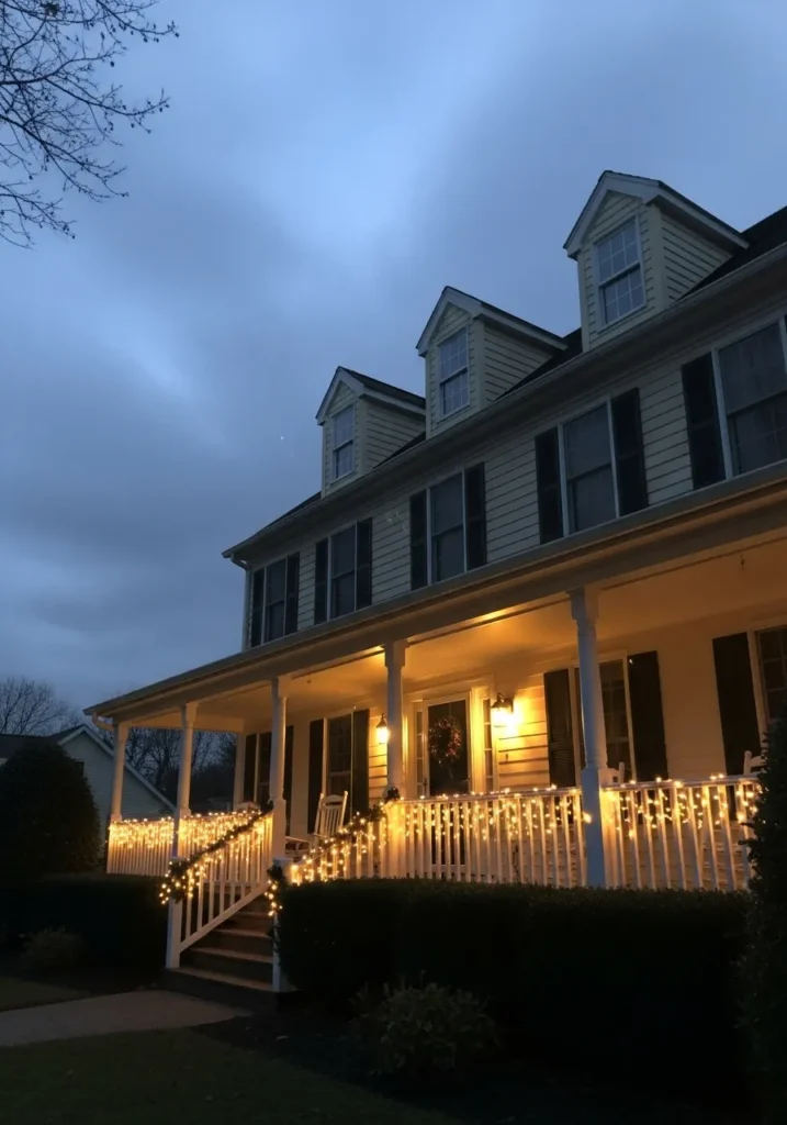 I absolutely love how peaceful this setup feels. It’s elegant without trying too hard and gives off that “quiet Christmas evening” mood I always dream about. The warm white lights make the whole space feel calm and cozy, like the kind of porch where you’d pause for a deep breath before heading inside with a mug of cocoa. It’s simple, understated, and beautifully balanced—the kind of holiday lighting that makes your home glow in the softest, most graceful way.