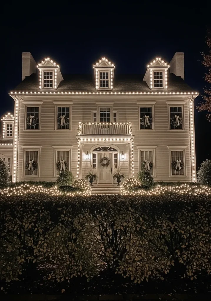 This stunning colonial-style home looks straight out of a Christmas card, with every edge perfectly traced in warm white lights that glow like pearls against the crisp night sky. Each window is dressed with elegant wreaths tied in white ribbons, creating a graceful rhythm across the symmetrical façade. The soft twinkle of lights across the hedges adds just the right amount of sparkle without overwhelming the classic charm of the architecture. The front porch, flanked by two potted evergreens, feels welcoming yet refined—like it’s ready to host a timeless holiday gathering.