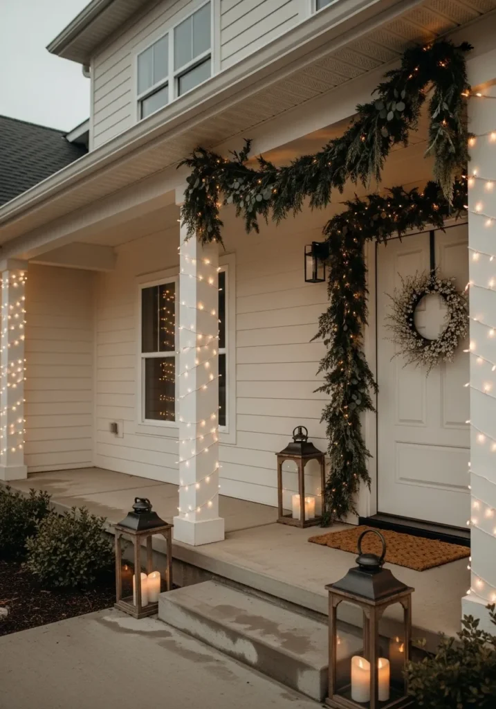 This soft and inviting porch feels like the perfect welcome home moment. The creamy white exterior is gently wrapped in strings of warm white fairy lights that twinkle like candlelight against the night. Evergreen garlands drape beautifully around the doorway, adding a hint of natural texture without overpowering the scene. The lanterns with flickering candles scattered along the steps bring just the right touch of charm and warmth, balancing the clean lines of the modern siding with cozy Christmas spirit.
