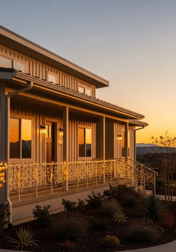 This home design feels like the perfect blend of simplicity and serenity. The modern farmhouse exterior features soft neutral siding, clean lines, and a welcoming porch lined with delicate warm white fairy lights. The subtle sparkle along the railings gives the house a soft golden glow, especially as the sun sets behind the hills. The gentle light from the porch sconces ties everything together, creating that magical hour where everything feels calm and cozy.