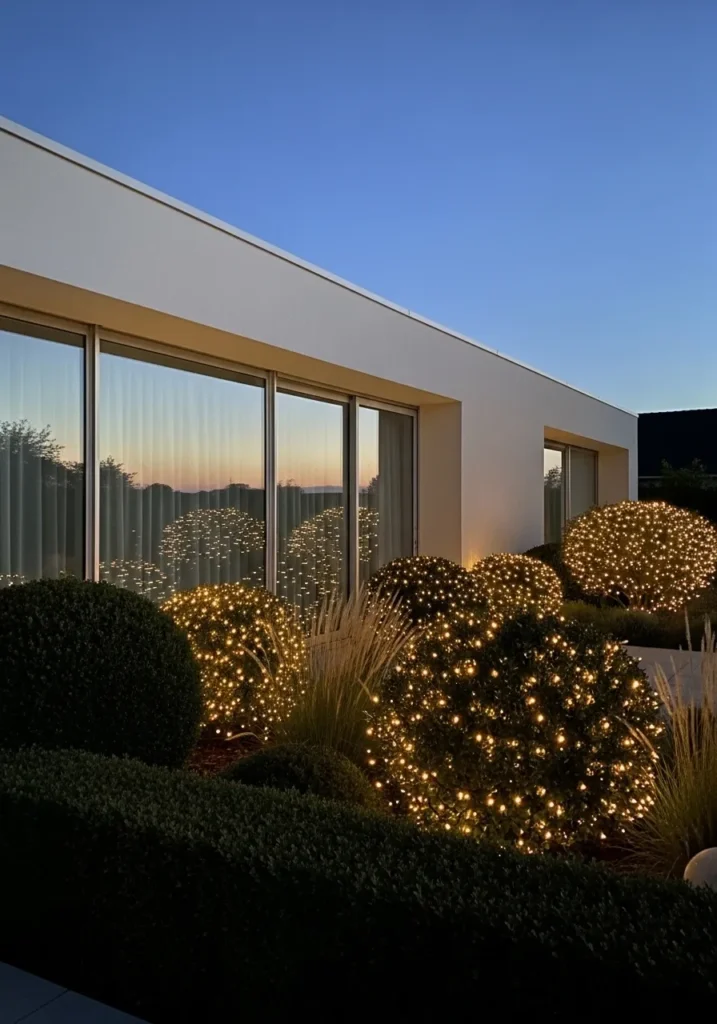 This modern home keeps things beautifully minimal with its clean white walls and sleek glass windows, letting the soft sparkle of warm fairy lights take center stage. Each perfectly shaped shrub is wrapped in tiny golden bulbs, creating a magical garden glow that feels both elegant and cozy. The neat landscaping and gentle evening light reflect perfectly off the windows, making the entire space look calm, symmetrical, and quietly luxurious.