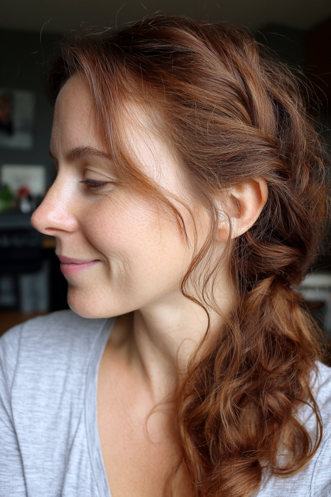 A relaxed side braid hides oil at the roots while still looking pretty and intentional. It works especially well on second or third day hair.