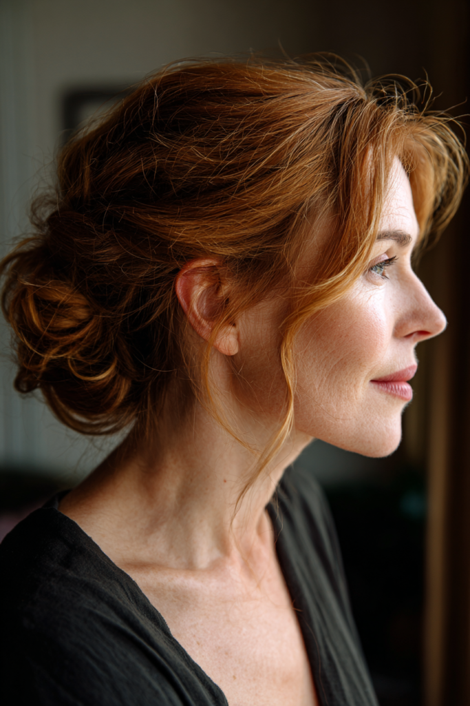 This style features a stunning vibrant copper red shade with lots of natural movement and soft texture. The hair is loosely gathered into a low textured chignon at the nape of the neck which gives it a classic yet effortless silhouette. Long layers are pulled forward to create gentle waves that frame the face and soften the overall look. It has a beautiful matte finish that looks touchable and airy without any of the stiffness you get from heavy styling products.
