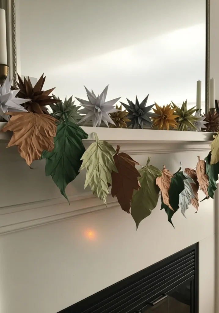 Here’s a creative twist that feels earthy and elegant all at once. This mantle is lined with folded paper stars and garlands of hand-cut leaves in shades of green, gold, and brown. The mix of metallic tones and natural leaf shapes strikes a perfect balance between festive and organic.