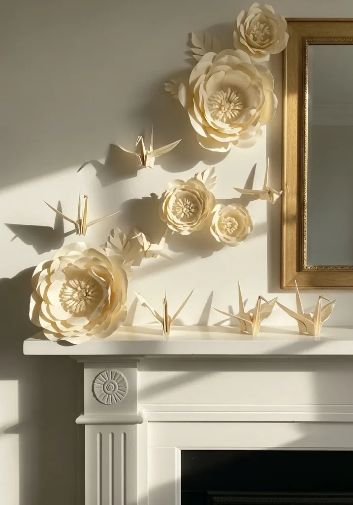 This mantle looks like a delicate art installation, with large paper flowers blooming up the wall and origami cranes floating gracefully among them. The soft cream tones reflect the light beautifully, adding warmth and charm.