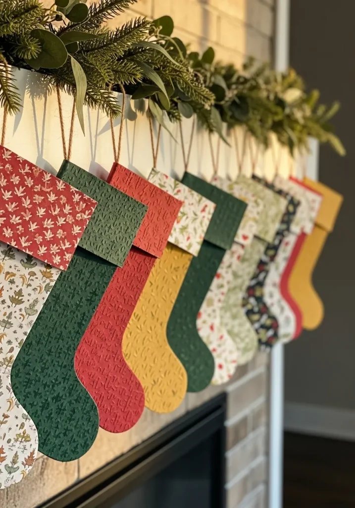 These colorful paper stockings hang neatly beneath a lush greenery garland, each one made from patterned and textured paper in festive shades of red, green, mustard, and cream. They bring instant joy and personality to the fireplace.