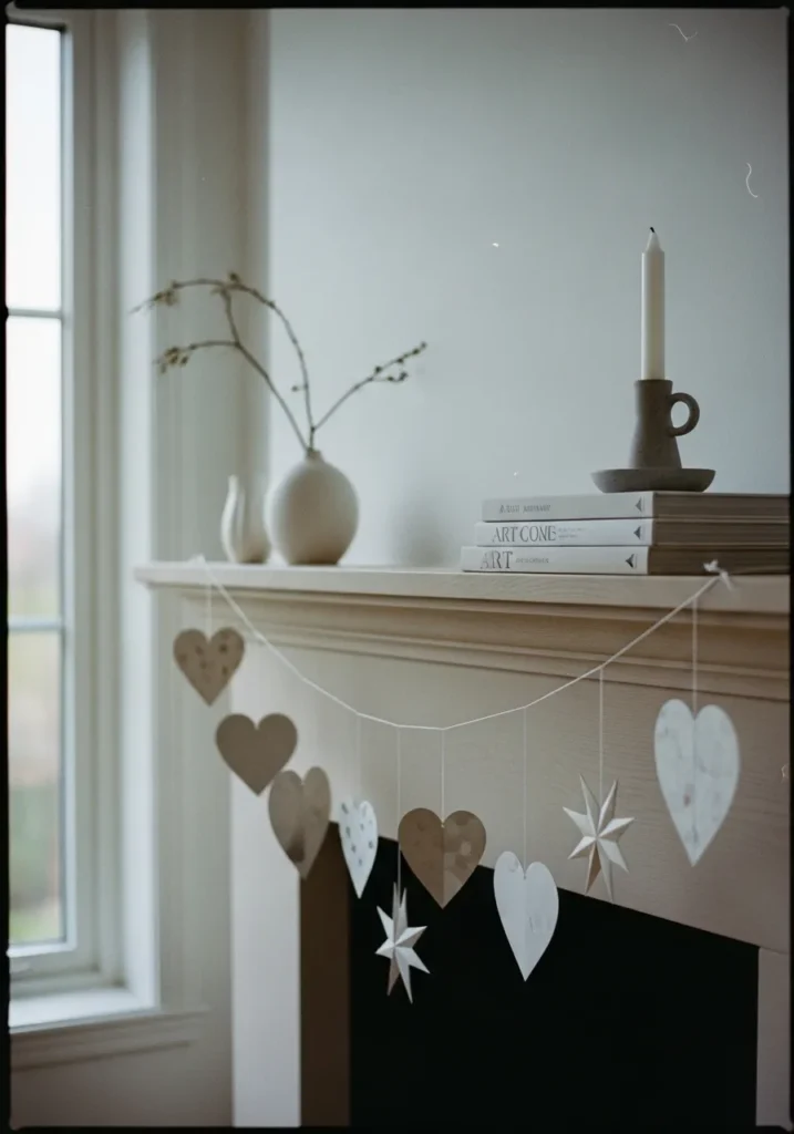 A delicate garland of paper hearts and stars hangs across this light-toned mantle, creating a soft and dreamy look. Paired with simple decor like a candle and vase, it feels peaceful and effortlessly chic.