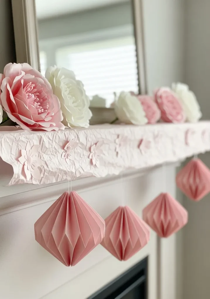 Large paper blooms in blush and white rest gracefully along the top of this mantle, while folded diamond ornaments hang below for a balanced and elegant look. The texture of the paper gives everything a soft, handcrafted beauty that feels light and romantic.