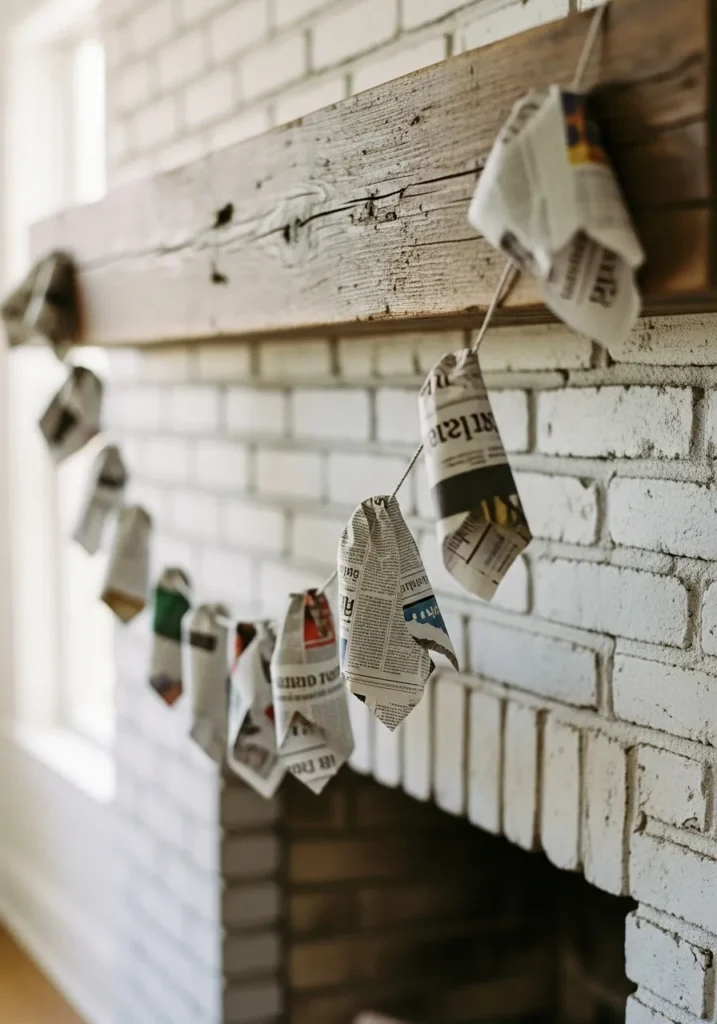 This creative mantle idea gives old newspapers a new life by turning them into a charming string garland. The crumpled paper shapes add texture and personality against the rustic wood beam and white brick background.